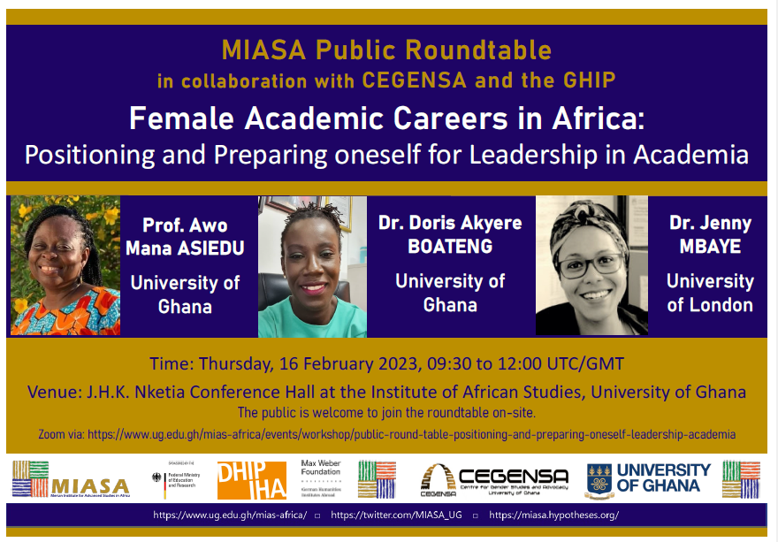The Round Table was part of the annual MIASA workshop on Female Academic Careers in Africa, organised in collaboration with the German Historical Institute Paris (GHIP) and the Centre for Gender Studies and Advocacy (CEGENSA), University of Ghana (UG), from 15 to 17 February 2023 on Legon campus. Twenty early- and mid-career female academics from the Social Sciences and Humanities, who are based at universities or research institutes across the African continent, participate in this workshop.